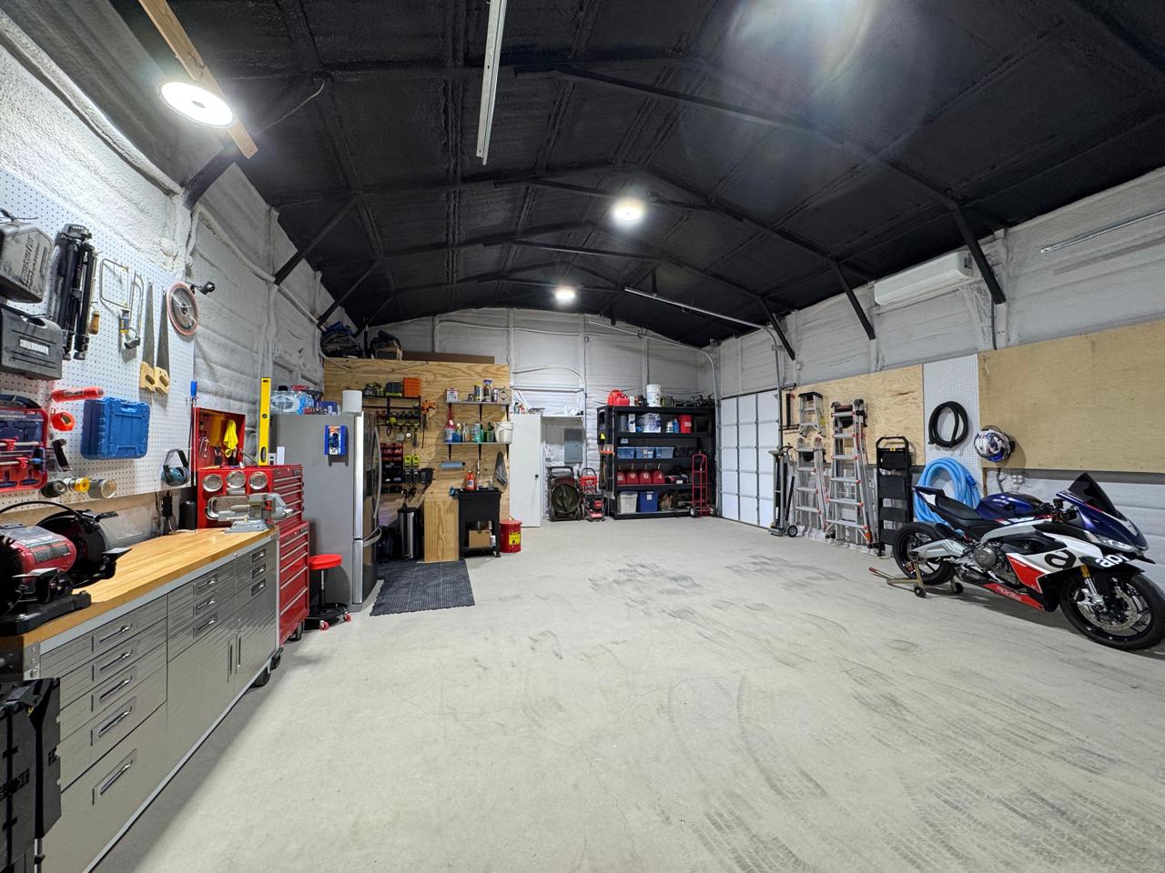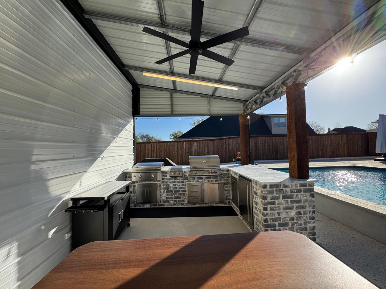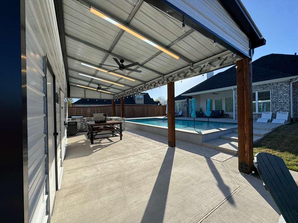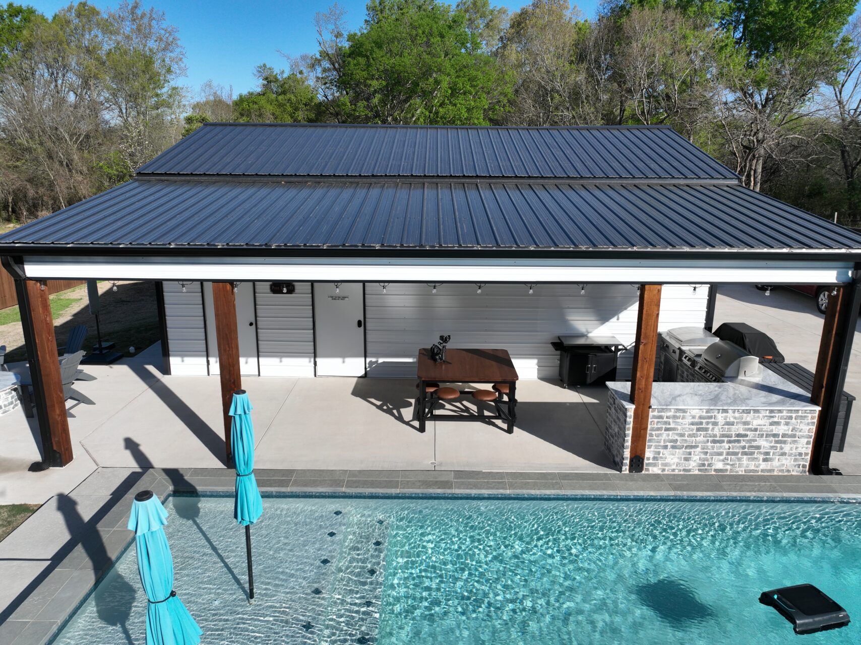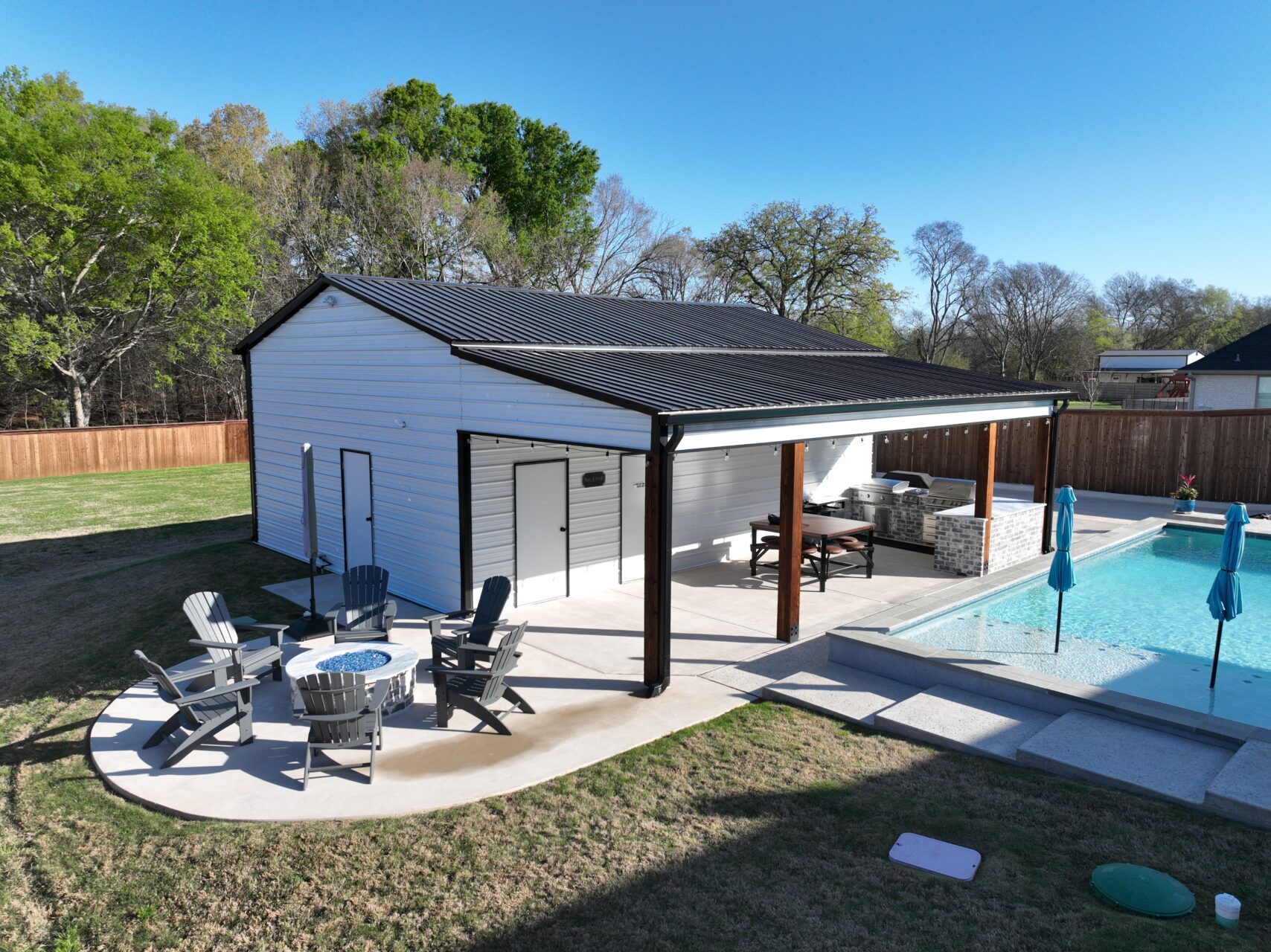 This 24×34 tubular metal building sits perfectly around the pool. It doesn’t just serve as a metal building; it provides extra storage, a fully functional workshop, and a stylish design that complements the summer vibe.